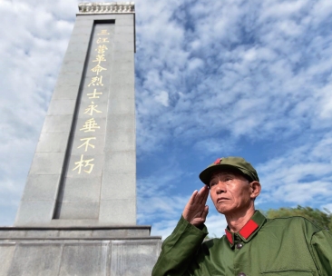 清晨,一轮红日从江面上升起,三江营革命烈士纪念碑上的红五星在阳光照射下熠熠生辉。年过花甲的张明海穿戴整齐,在烈士纪念碑前行了个标准的军礼,开始了他一天的清扫和接待工作。